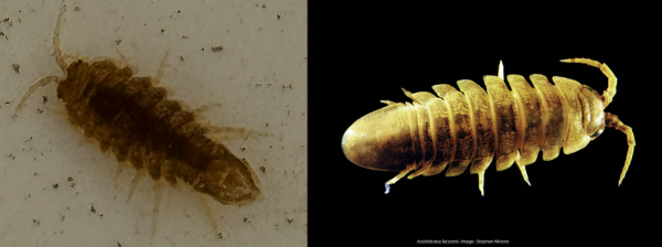 The freshwater Isopod Austridotea. Left image from the field reserach credit Milly Farquar; right image credit Stephen Moore