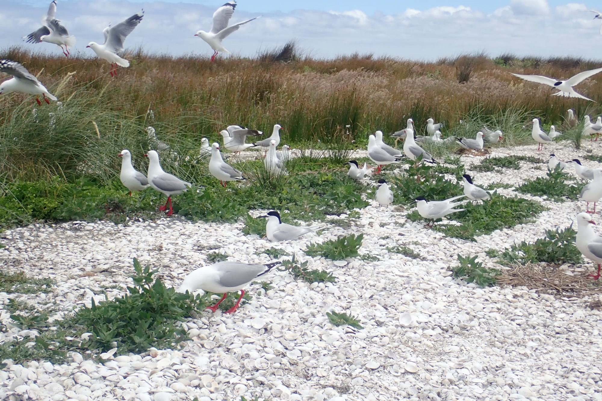 Gulls and black fronted terns on a shelly cay (a small island) in Te Whanga lagoon. Image: Peter de Lange